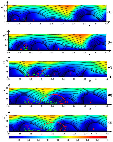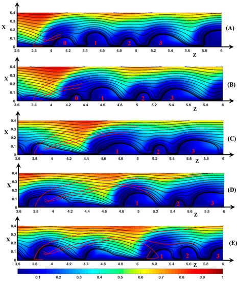 Fluid trajectories. Black lines: static streamlines starting from the inlet. Red lines: dynamic streamlines starting from zo = 3.9 (xo = 0.01, 0.08, 0.09). Color plot: cation concentration. Red numbers: vortex numbering. Vortex n°0 is the vortex in which the trajectories source is located at t’ = 0. (A) t’ = 55; (B) t’ = 85; (C) t’ = 135; (D) t’ = 190; (E) t’ = 245. ΔΦ = 27, , .