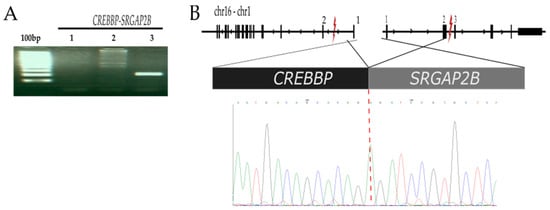 Characterization of the CREBBP-SRGAP2B gene fusion. (A) 100 bp marker, PCR of CREBBP-SRGAP2B using H20 as negative control (lane1), DNA genomic (lane 2), and cDNA from total RNA isolated from 74MO sample (lane 3). (B) Schematic diagram showing the structure of CREBBP-SRGAP2B fusion, exon 1 of the CREBBP gene is fused in frame with exon 3 of the SRGAP2B gene. The symbol “lightning” indicates the breakpoint region. A CREBBP-SRGAP2B fusion sequence is shown below, with a schematic derived by the cloning and sequencing of the RT-PCR product.