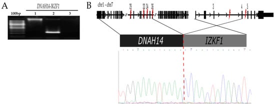 This fusion gene was observed in a 1.8-year-old girl with standard-risk Pre-B ALL (179MO) who achieved complete remission after the induction of the remission phase. The bioinformatic analysis reported different sites of fusion between DNAH14 (exon 29, 33, 34 and 36) and IKZF1(exon 4 and 5, coverage and reading depth are displayed in Figure S2), suggesting that these fusions resulted from alternative splicing. By genomic DNA-PCR-validation of the original sample, we identified the breakpoint between exon 36 of DNAH14 and exon 4 of IKZF1 (Figure 2), resulting in a constituted fusion for the first 36 exons of the DNAH14 and exon 4 and upstream exons of IKZF1. This DNAH14-IKZF1 was in-frame and predicted to encode a chimeric protein where the final region comprising both the four-zinc finger and the dimerization of IKZF1 are truncated.