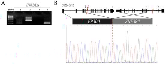 Identification of the EP300-ZNF384 fusion. For the confirmation of EP300-ZNF384 fusion, the original RNA sample was used. Primers were designed to amplify two regions of 106 bp and 250 bp, named internal and external, respectively (Table S1). (A) 100 bp marker, RT-PCR of EP300-ZNF384 with primers EP300-ZNF384-ext (lane 2), with primers EP300-ZNF384-int (lane 4), and negative control (H2O) (lanes 1 and 3). (B) Schematic representation of the localization of the breakpoints within ZNF384 and EP300 and the corresponding result of sequencing where exon 6 of the EP300 gene and exon 3 of the ZNF384 gene are fused in this transcript. The symbol “lightning” indicates the breakpoint region.
