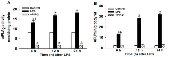 PIP-2 inhibits the increased lung aiPLA2 activity and increased ROS generation that follows LPS administration. LPS (5 µg/g body weight) was administered by intratracheal (IT) instillation along with liposomes alone (labeled as LPS) or with PIP-2 in liposomes (labeled as +PIP-2). Control was liposomes alone without LPS (labeled as control). Mice were sacrificed at 6, 12, or 24 h after LPS and some lungs were perfused in situ for 15 min with saline solution (A) while others were perfused in situ for 15 min with saline solution containing the fluorophore difluorofluoroscein diacetate (DFF-DA) (B). Lungs were then homogenized and assayed for aiPLA2 activity (A), or fluorescence of the lung homogenate as an index of ROS production (B). Results are mean ± SE for n = 3 for (A) and n = 4 for (B). * p < 0.05 vs. both the corresponding control and the corresponding LPS+PIP-2 values at the same time point; § p < 0.05 vs. 12 h and 24 h LPS values; Δ p < 0.05 vs. corresponding control value.