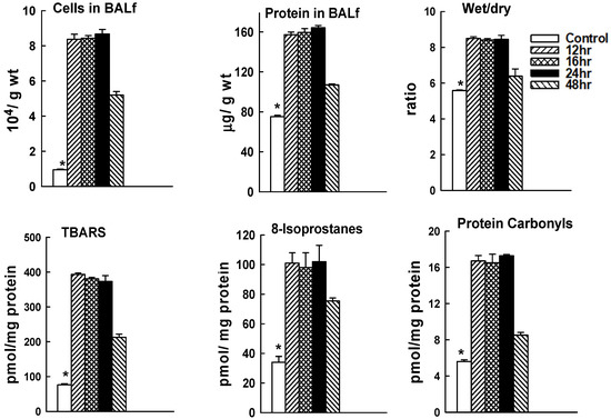 The sensitivity to LPS-mediated injury varies significantly among mouse strains [28]. For this study, we determined the course of lung injury for C57Bl/6J mice given IT LPS at 5 µg/g body weight (Figure 3). Lungs showed considerable injury when evaluated at 12 h after LPS as indicated by increased nucleated cells in the BALf, increased BALf protein, and increased wet to dry lung weight ratio (p < 0.05).These results are compatible with lung inflammation (cells in BALf), alteration of the alveolar-capillary permeability barrier (BALf protein), and lung fluid accumulation (lung wet/dry weight). The increase in lung tissue TBARS, 8-isoprostanes, and protein carbonyls indicates oxidative stress with oxidation of lung tissue lipid and protein components. These indices of lung injury showed similar values at 12, 16 or 24 h after LPS (Figure 3), indicating that the degree of lung injury was essentially stable at 12–24 h after this non-lethal dose of LPS. Partial recovery (~50%, p < 0.05) in the indices of lung injury was seen at 48 h although they were still elevated compared with control (p < 0.05).