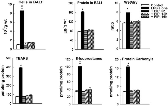 The first experiments to evaluate PIP-2 in the lung injury model utilized the concurrent administration of PIP-2 with LPS which markedly protected against subsequent lung injury. Measurements to evaluate acute lung injury following LPS administration included (a) nucleated cells in BALf (inflammation); (b) protein in BALf (alveolar-capillary permeability); (c) lung wet to dry weight ratio (lung edema); and (d) lung TBARS, 8-isoprostanes, and protein carbonyls (oxidation of tissue lipids and proteins). All of these indices of injury were significantly elevated in lungs that were evaluated at 12–24 h after administration of LPS. However, none of these indices of tissue injury were altered in lungs when PIP-2 was administered concurrently with LPS. Thus, PIP-2 clearly can prevent ALI associated with LPS administration in mice.