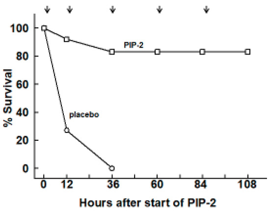 PIP-2 prevents mouse mortality with high dose LPS. Mice were administered LPS (15 µg/g body weight) by intratracheal instillation and divided into two groups. At 12 h after LPS, one group was given PIP-2 (2 µg/g body weight) in liposomes by intravenous injection (IV) while the other group (placebo) was given liposomes alone. The time of treatment initiation (12 h after LPS) is plotted as zero time. Treatment was repeated at 12, 36, 60, and 84 h after the initial dose of PIP-2, as indicated by the arrows. Surviving mice were sacrificed at 108 h after start of PIP-2 (120 h after LPS). n = 12 for placebo and n = 11 for PIP-2.