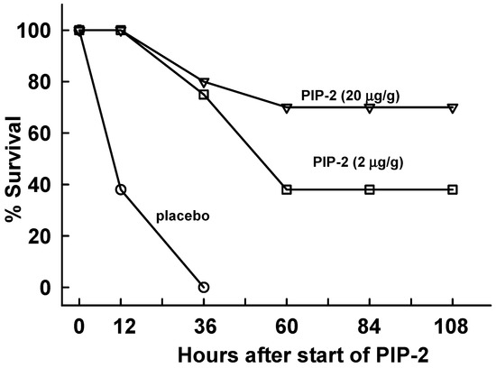 PIP-2 increases survival in mice given intraperitoneal LPS. Mice were administered LPS (15 µg/g body weight) by intraperitoneal (IP) injection and were 12 h later were divided into three groups. The placebo group (n = 8) was given IV liposomes only (no PIP-2). The two other groups were given PIP-2 in liposomes by IV injection, at either 2 µg/g body weight (n = 8) or 20 µg/g body weight (n = 10). Similar to the protocol described in Figure 5, the time of treatment initiation (at 12 h after LPS) was plotted as zero time.The dose of PIP-2 was repeated 12 h later and then 3 subsequent doses were gived at 24 h intervals (36,60,and 84 h after the start of PIP-2), co-incident with the plotted points. Surviving mice were sacrificed 24 h later at 108 h after start of treatment (120 h after administration of LPS).