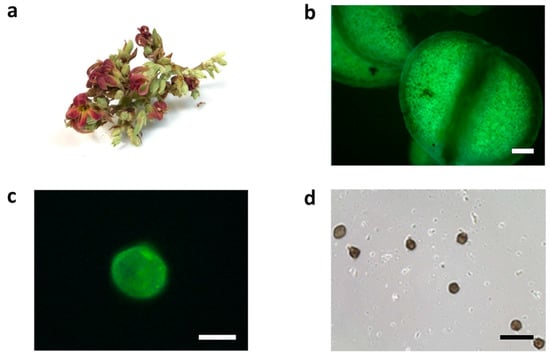 Cashew flowers and pollen particles. (a) a cashew flower, (b) autofluorescent image of anthers from a cashew flower (scale bar represents 100 µm), (c) autofluorescent image of pollen grains from a cashew flower (scale bar represents 20 µm), (d) pollen grain from a cashew flower used for measurement (scale bar represents 100 µm).