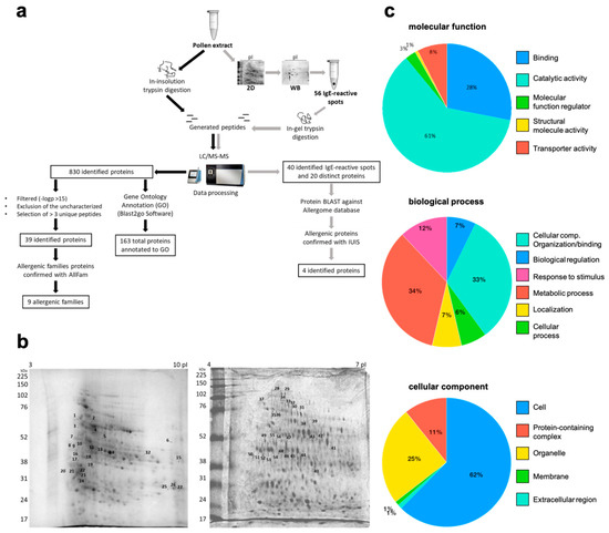 Proteomics of cashew tree pollen reveals the presence of allergenic protein families and IgE-reactive molecules. (a) Summarized workflow and results of the proteomic analyses. (b) 2D-SDS-PAGE (isoelectric point (pI) 3–10 and 4–7) stained by Coomassie. All excised spots subjected to mass analysis are numbered (1–27 and 28–56). (c) Gene ontology annotation of identified proteins from cashew tree pollen using PantherDB. A total of 163 proteins were annotated to a biological process, cellular component, and molecular function.