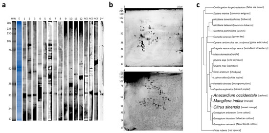 Immunoblot analysis of cashew tree pollen extract. (a) Pollen extract (E) on reducing SDS-PAGE and stained with Coomassie. Immunoblot of individual allergic patients’ sera (n = 12), negative controls (NC1, NC2, and NC3) and second antibody control (2nd). (b) 2D Western blotting (2D WB) showing the IgE binding of pooled sera (1–12) to cashew tree pollen extract. (c) Phylogenetic tree built from species found in homolog proteins identified after 2D WB. Species close to Anacardium occidentale are highlighted in bold. pI, isoelectric point.