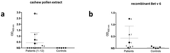 Cashew tree pollen and recombinant birch isoflavone-reductase (Bet v 6) are recognized by patients’ sera in ELISA. (a) IgE reactivity to immobilized cashew tree pollen extract was assessed with individual patients’ sera (n = 12) and non-atopic human sera (n = 5). (b) IgE reactivity to immobilized recombinant Bet v 6 was assessed with patients’ sera that were positive in ELISA for cashew tree pollen extract (n = 5) and non-atopic human sera (n = 5). The NS indicates the response threshold calculated as 3× SD of the buffer control signal.