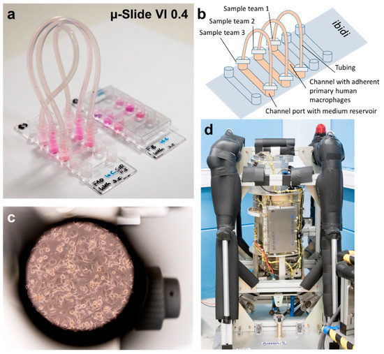 FLUMIAS TEXUS-54 experiment hardware. (a) An ibidi ibiTreat μ-Slide 0.4 (ibidi µ-Slide) prepared for flight; (b) Schematic of flight configuration of an ibidi µ-Slide closed with luer plugs and tubings. Three science teams seeded different cell types into three respective channels; (c) Primary human macrophages visualized by light microscopy. (d) The confocal laser spinning disk fluorescence microscope FLUMIAS, engineering model.