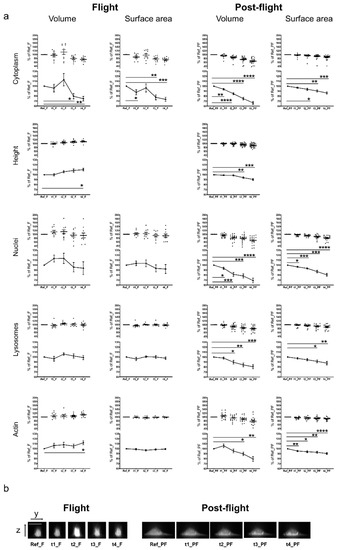 Statistical evaluation was performed with the software GraphPad Prism 5.0 (GraphPad software Inc., San Diego, CA, USA). To compare cell volume, surface area, and cell height in Figure 3, a repeated measurement ANOVA with a subsequent Dunnett’s post-test was used. A paired t-test was applied to compare the cell areas identified by the maximum intensity projection (Figure 4). Each time point was compared to the respective reference run value of the flight and post-flight samples. P-values ≤0.05 were considered as significant (≤0.05 = *, ≤0.01 = **, ≤0.001 = ***, ≤0.0001 = ****).