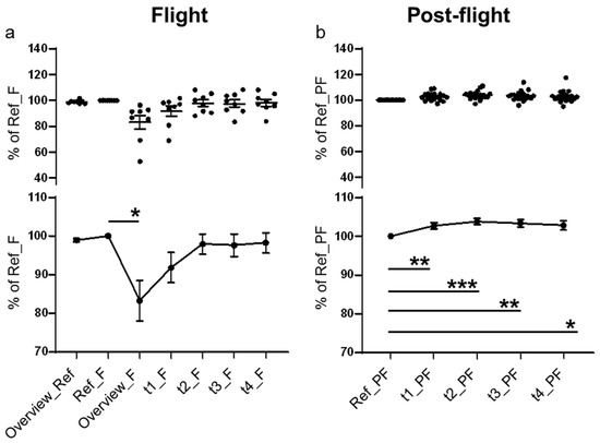 Then, a maximum intensity projection (MIP), a volume visualization method for 3D data that projects in a 2D z-projection plane, was performed for each time point. The single cell recordings (Figure S5), as well as the average values demonstrated a clear and significant decrease at the first measurement point in microgravity (Figure 4a), between 4 and 19 s after the onset of microgravity (Table 3; T+70–85 s). At measurement point t1_F (51–76 s after the onset of microgravity), F-actin intensity started to recover and returned to the values of the reference run at time point t2_F (126–151 s after the onset of microgravity) (Figure 4a). In the post-flight recordings, neither the single cell data nor the averaged curve showed this effect (Figure 4b). During the post-flight measurements, the SiR-actin signal constantly increased (Figure 4b).
