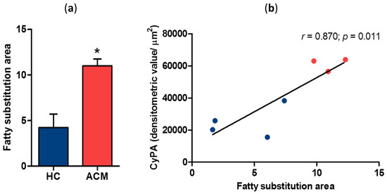 To investigate whether CyPA expression levels correlate with myocardial fatty substitution, we assessed in RV the amount of myocardial area replaced by adipose tissue. Noteworthy, fatty substitution was significantly larger in ACM patients than in HC. In particular, fatty substitution area in the RV sections corresponded to 4.2 ± 2.9 of analyzed tissue in HC and 11.0 ± 1.3 in ACM patients (p = 0.014, Figure 2a). Interestingly, CyPA expression levels significantly and positively correlated with adipose substitution extent in RV sections (Pearson r = 0.870, p = 0.011; Figure 2b).