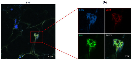 For immunofluorescence staining, RV tissue sections were deparaffinized, rehydrated, and boiled for 20 min in target retrieval solution (Tris-EDTA, pH 9.0; DAKO). After washing in PBS, slides were blocked for 30 min in 10% goat serum-PBS (Sigma Aldrich, St. Louis, MO, USA) and incubated with specific primary antibodies against CyPA (1:100, sc-133494; Santa Cruz Biotechnology, Santa Cruz, CA, USA), PLIN1 (1:100, BP5015; OriGene, Herford, Germany) and CD29 (1:200, NCL-CD29; Leica, Wetzlar, Germany) in 2% goat serum-PBS O/N at 4 °C. After washing in PBS, sections were incubated with Alexa546 (ThermoFisher, Waltham, MA, USA), Alexa488 (Santa Cruz Biotechnology), and Alexa633 (ThermoFisher) fluorochrome conjugated secondary antibodies dissolved in 2% goat serum-PBS (1 h, RT in the dark), respectively. To visualize cell nuclei, Hoechst33342 (Invitrogen, Carlsbad, CA, USA) diluted 1:1000 in PBS (15 min, RT in dark) was added. Twenty images for each section were taken at 20× magnification using the software Zen2010D of the confocal microscope (Zeiss LSM710-ConfoCor 3 LSM).
