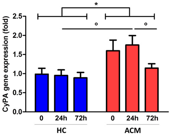 We then isolated C-MSC from ACM patients and HC RV specimens and cultured them in adipogenic condition to evaluate CyPA gene expression levels at different time points (0, 24 h, and 72 h). Interestingly, C-MSC derived from ACM and HC showed a different pattern of CyPA gene expression over time (p = 0.021, Figure 4). Specifically, CyPA gene expression was modulated over time in ACM C-MSC, but not in HC C-MSC. The highest difference was observed after 24 h of adipogenic conditioning, when CyPA gene expression was upregulated in ACM (mean ± SEM: 1.75 ± 0.25) with respect to HC C-MSC (0.95 ± 0.15, p = 0.015; Figure 4).