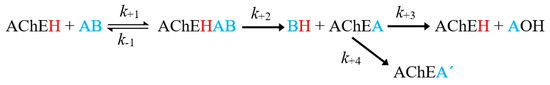 General scheme of the inhibition of acetylcholinesterase (AChE) by an organophosphorus (OP) inhibitor. Where AChEH is the free enzyme; AB, the OP molecule; AChEA’, the dealkylated form of the phosphorylated enzyme (AChEH) [14,15].