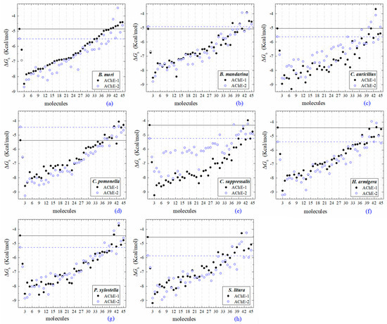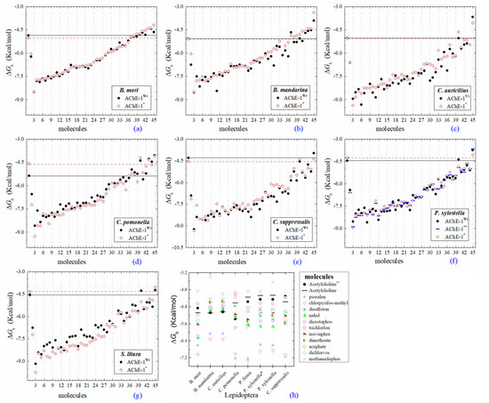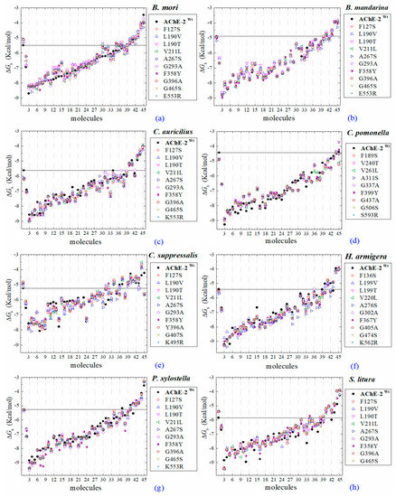 All the predicted ΔGb from the docking of 43 OPs molecules (in addition to acetylcholine and psoralen molecules) on AChE enzymes of Lepidoptera (B. mandarina, B. mori, C. auricilius, C. suppressalis, C. pomonella, H. armígera, P. xylostella, and S. litura) are presented in three sections: (1) AChE-1 and AChE-2, both wild type, (2) modified AChE-1, and (3) modified AChE-2. In order to carry out an analysis of results, all the predicted ΔGb are presented graphically (Figure 2, Figure 3 and Figure 4, respectively); the molecules evaluated are plotted against the estimated free binding energy (predicted ΔGb) obtained. In each section, the order of the molecules is presented according to the predicted ΔGb recorded in B. mori (e.g., Figure 2a, Figure 3a and Figure 4a).