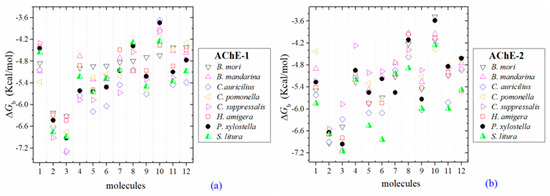 (A) AChE-1 and AChE-2 (both wild type enzymes), the energy threshold registered for ACh shows a difference in magnitude between ΔGbAChE-1 wild type and ΔGbAChE-2 wild type (see Figure 6), the exception is AChE of B. mandarina (Figure 2b) (the energies recorded to AChE-2-ACh complexes were equal in magnitude, ΔGbAChE-1 wild type = ΔGbAChE-2 wild type). The result obtained in AChE of B. mandarina suggests that there is no difference in the affinity of AChEs (ΔGbAChE-2 wild type and ΔGbAChE-2 wild type) for the substrate. Whereas, in the other systems, a difference in affinity between AChE and ACh is predicted, which could be confirmed by catalytic activity studies of the enzymes.