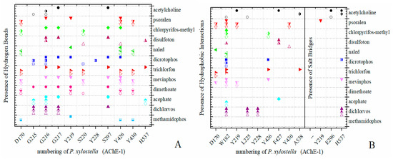 PLIP (Protein-Ligand Interaction Profiler) results in AChE-1 of P. xylostella. Identification of noncovalent interactions; (A) hydrogen bonds, (B) hydrophobic interactions and salt bridges. Full symbol, AChE-1 wild type; empty symbol, modified AChE-1 by A201S and G227A; half full symbol, modified AChE-1 by A201S, G227A, and F290A.