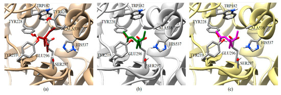 Graphical representation of the acephate binding on AChE-1 of P. xylostella. Spatial localization of acephate structure on the AChE-1 enzyme as a result of docking is shown in three molecular models: Conformation acquired on AChE-1 wild type, acephate is chain in red (a), conformation acquired on modified AChE-1 (A201S and G227A, and -A201S, G227A, and F290A, respectively), the acephate is chain in green and magenta (b and c, respectively). The main interactions are shown in Figure 5. The location of SER297 is shown, which is an important residue for the effect of enzyme phosphorylation. HIS537 in AChE-1 of P. xilostella is stabilized by GLU296 and GLU423. The pKa values of ionizable residues could be predicted with PROPKA [31].
