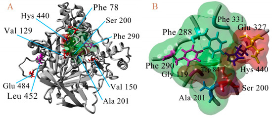 3D atomic model of AChE, numbering of T. californica. (A). Location of waste susceptible to proposed point mutations. (B) Proximity of catalytic triad (Ser200, Hys440, and Glu327).