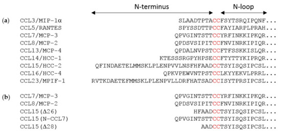 (a) Partial sequences of nine cognate chemokine ligands for the receptor CCR1; and (b) partial sequences of the chemokines used in this study. The conserved CC motif is in red. The arrows at the top indicate the N-terminal and N-loop regions, which participate in receptor recognition.