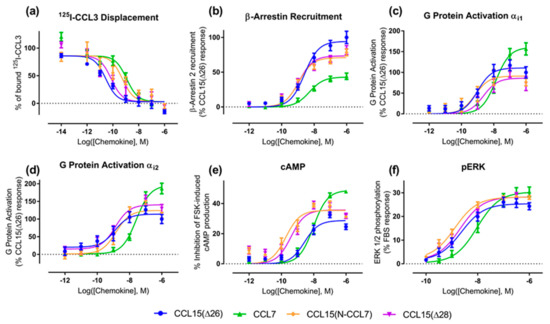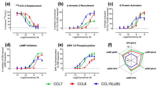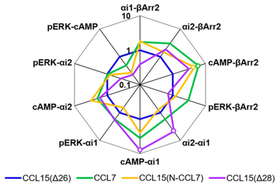 Biased agonism has been observed for several chemokine receptors, including CXCR2, CXCR3, CCR1, CCR2, CCR4, CCR5, CCR7, and CCR10 [20,21,22,23]. In particular, Rajagopal et al. compared the abilities of several chemokine ligands to activate CCR1, giving rise to inhibition of cAMP signaling, recruitment of β-Arrestin (βArr), and internalization of the receptor [20]. They observed, for example, that, when compared to the chemokine CCL3 as a reference, the chemokines CCL5 and CCL23 displayed preferential activation of the βArr pathway relative to the cAMP (Gαi-coupled) pathway.