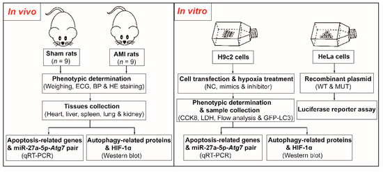 In this study, we established a model of hypoxia in H9c2 cells and developed an AMI model in the rat to investigate the miR-27a-5p expression pattern in H9c2 cells and the main visceral tissues of rats (Figure 1). We found that hypoxia induced cell injury in vivo and in vitro and was accompanied by downregulation of miR-27a-5p expression. miR-27a-5p upregulation attenuated hypoxia-induced cardiomyocyte injury by regulating autophagy and apoptosis via Atg7, suggesting that miR-27a-5p may be a novel treatment strategy for hypoxia-related heart diseases.