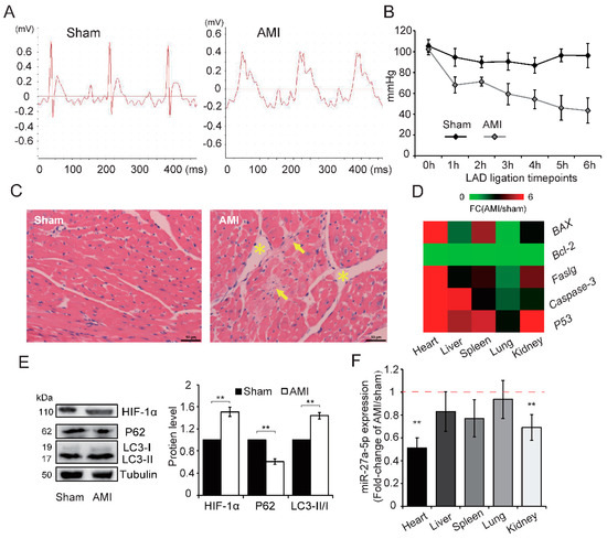 To investigate whether the miR-27a-5p expression under hypoxia induced by AMI in vivo was similar to that in hypoxia-exposed cardiomyocytes in vitro, an AMI rat model was established by ligating the coronary artery [16]. We observed S-T segment elevation in the electrocardiogram (ECG) and a reduction in blood pressure (BP) in the AMI group compared with sham, which confirmed successful AMI (Figure 3A,B). A post hoc power analysis of ∆ BP obtained a power of > 0.90 with p = 0.05 in every LAD ligation timepoint (see “Statistical Analysis” for details on power analysis) (Table S1). We also found that the organ index in several main visceral tissues (except lung) was reduced (Table S2), which may be associated with the decreased left ventricular ejection fraction commonly observed after AMI [12]. Meanwhile, HE staining of the left ventricle showed that the cells in sham rat hearts were arranged uniformly with a normal gap, but local necrosis (indicated by arrowhead) and intercellular gaps (indicated by asterisk) were observed in AMI rats (Figure 3C). These data indicate that AMI induced severe damage in the rat myocardium.