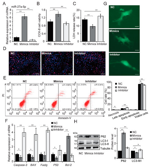 In this study, we first cultured H9c2 cells in hypoxic condition for 24 h to simulate hypoxia induced by AMI in vitro. We found that hypoxia increased HIF-1α protein expression (Figure 2A) and triggered cell injury, including a decrease in cell viability (p < 0.01; Figure 2B), increased cell membrane damage (p < 0.01; Figure 2C) and apoptosis and necrosis (p < 0.01; Figure 2D,E). Meanwhile, hypoxia significantly increased the expression of proapoptotic genes (Caspase-3, BAX, Faslg and P53, p < 0.01; Figure 2F), but decreased expression of the antiapoptotic gene Bcl-2 (p < 0.05; Figure 2F). Autophagy has previously been observed in ischemic heart disease [14,15] and autophagy levels were assessed in hypoxia-exposed H9c2 cells by western blot and autophagosome formation. These data showed that hypoxia increased autophagosome formation (Figure 2G) and promoted the switch of LC3-I to LC3-II. It also resulted in a reduction in P62 protein expression (p < 0.01; Figure 2H). Next, miR-27a-5p expression pattern was assessed in hypoxia-exposed H9c2 cells using qRT-PCR. miR-27a-5p expression decreased in a time-dependent manner (Figure 2I). These results indicate that hypoxia induced cell injury and reduced miR-27a-5p expression levels in H9c2 cells.