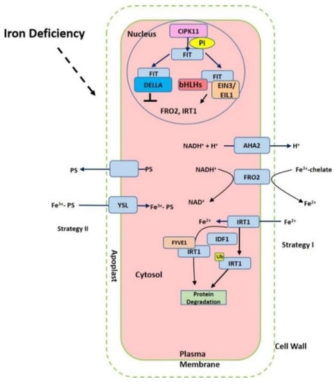 Iron in the rhizosphere is mainly present as Fe3+ which is not readily accessible to plants. Different plant species have evolved different strategies for iron acquisition from soil (Figure 1). Non-graminaceous plants, such as tomato and Arabidopsis, known as strategy-I plants, use a reduction-based strategy, in which plasma-membrane (PM)-localized H+-ATPases (AHAs) release the protons to increase rhizosphere acidification and promote Fe3+ solubility. Subsequently, the available ferric Fe3+ is reduced to the more soluble ferrous Fe (Fe(II)) by ferric reduction oxidases (FROs) at the apoplast [5]. The reduced ferrous ion (Fe2+) is imported into root cells by the Fe2+-regulated transporters such as the iron-regulated transporter (IRT1) [6,7]. Additionally, graminaceous plants, including rice, barley, and maize, known as strategy-II plants, use a chelation-based strategy to release phytosiderophores (PS). PS, as strong Fe chelators, are secreted into the rhizosphere with a high affinity for binding Fe (III) [8,9]. PS-Fe(III) is then taken up into root cells through the yellow stripe (YS) or yellow stripe-like (YSL) transporters [10].