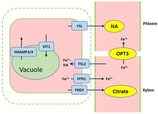 Overview of iron transport from roots to shoots. Ferric reductase defective 3 (FRD3) and ferroportin1 (FPN1) are responsible for importing citrate and iron into the xylem. Iron chelation with citrate or NA are translocated to shoots. Yellow stripe-like 2 (YSL2) contributes to the Fe2+-NA distribution from the xylem to neighboring cells. Iron is loaded into vacuole through VIT1, while iron efflux of vacuolar occurs via NRAMP3 and NRAMP4. OPT3 mediates the Fe transport to sink tissues via the phloem.