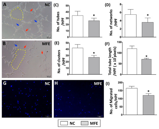 Maternal fructose exposure impaired angiogenic activity of bone marrow-derived endothelial progenitor cells. (A,B) In vivo angiogenic activity analysis (matrigel) on bone marrow-derived endothelial progenitor cells (BMDEPC) of 3-month-old offspring. (C) Calculation of tube formation in matrigel (red arrows). (D) Calculation of network formation in matrigel (yellow dotted line). (E) Calculation of cluster formation in matrigel (blue arrows). (F) Calculated of accumulated tube length. (G,H) Trans-well analysis to determine the migratory activity of BMDEPC. (I) Calculation of migrated cells in the trans-well assay. Results showed that the numbers of tube, network, and clusters in the MFE group were significantly lower than those in the NC group. NC, maternal control; MFE, fructose exposure. Scale bar in the lower-right corner indicates 100 μm. Error bars represent the standard deviation (SD). * Indicates statistical significance between NC and MFE group. n = 8 for each group.