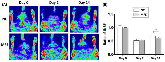 Maternal fructose exposure reduced blood flow recovery after induction of critical limb ischemia. (A) Laser Doppler scanning to determine the blood flow recovery after induction of CLI. (B) Quantitation and calculation of blood flow. The parameter ratio of ischemia to normal blood flow (INBF) was used to evaluate the blood flow recovery initiated by neovascularization after CLI. On day 2 after CLI and day 0 prior to CLI, the ratio of INBF showed no difference between NC and MFE groups. However, by day 14, the blood flow recovery in the NC group was significantly higher than the MFE group. NC, normal control; MFE, maternal fructose exposure; CLI, critical limb ischemia. Error bars represent the standard deviation (SD). * Indicates statistical significance between NC and MFE group. n = 8 for each group.