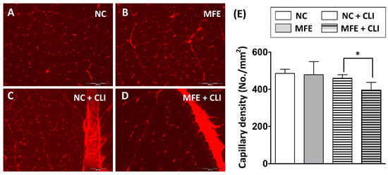 For immunofluorescent staining, isolated quadriceps were mounted in OCT and used for preparing cryosections. Sections were fixed and permeated with ice-cold acetone or 4% paraformaldehyde with 0.5% Triton X-100, and then incubated with antibodies against CD31 at 4 °C overnight. Coverslips or slides were then incubated with Alex594-conjugated goat anti-mouse or rabbit IgG (Invitrogen, Carlsbad, CA, USA). After counterstaining with DAPI, sections were examined under a fluorescent microscope.