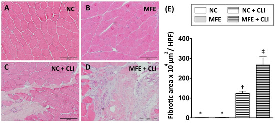 Maternal fructose exposure increased the fibrotic area in ischemic quadriceps after induction of critical limb ischemia. (A) Hematoxylin and eosin (H&E) staining for quadriceps. (B) Quantitation and calculation of the fibrotic area in the quadriceps. In normal conditions, no fibrotic area was found in quadriceps in both NC and MFE group. However, by 14 days after induction of CLI, the fibrotic area in MFE group was significantly higher than that in the NC group. NC, normal control; MFE, maternal fructose exposure; CLI, critical limb ischemia. Scale bar in the lower-right corner indicates 200 μm. Error bars represent the standard deviation (SD). Groups with different symbols (*, †, ‡), p< 0.05. n = 8 for each group.