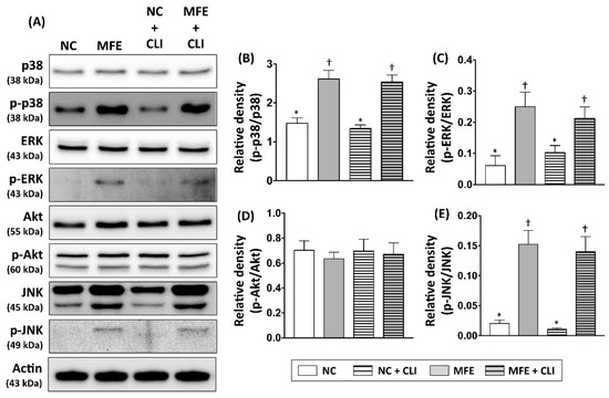 To examine whether intracellular signaling that participates in cellular proliferation, stress response, and endothelial differentiation in circulating EPCs of offspring were regulated by MFE, Western blots were performed to detect the expression and activation levels of Akt, ERK, p38-MAPK, and JNK in peripheral blood mononuclear cells of adult offspring (Figure 6A). By 14 days post induction of CLI, both expression and phosphorylation levels of Akt showed no difference among groups (Figure 6D). Although the expression levels of p38-MAPK and ERK were not regulated by either MFE or CLI, the phosphorylated levels of those proteins were significantly increased with MFE (Figure 6B,C). In addition, both expression and phosphorylation levels of JNK in the MFE group were higher than that in the NC group (Figure 6E). However, the induction of CLI showed no significant synergistic effects on regulating expression and phosphorylation of p38-MAPK, ERK, and JNK.
