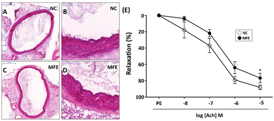 The descending aorta was isolated, cleaned, and cut into slices 2 mm in length for evaluating the contractile and relaxant response as previously reported [51] with modifications. Briefly, aortic rings were carefully mounted on an isometric force transducer (XDFT05; Singa, Taiwan) with a tension of 2.0 g and placed in an organ chamber filled with Krebs solution (NaCl, 99.01 mM; KCl, 4.69 mM; CaCl2, 1.87 mM; MgSO4, 1.20 mM; K2HPO4, 1.03 mM; glucose, 11.1 mM) maintained at pH 7.4 and bubbled with 95% O2–5% CO2. After equilibration of 40 min, 1 mM of phenylephrine (PE) was added to the organ chamber for the assessment of contractile activity and then 30 mM of acetylcholine was added to assess the endothelial integrity. After washing and re-equilibration for 20 min, the cumulative concentration of acetylcholine (Ach) was added in the organ chamber followed by 1 mM of PE to evaluate the endothelium-dependent vasorelaxant response. All data were acquired and analyzed using Panlab Compact Organ Baths (Harvard Bioscience, Holliston, MA, USA)