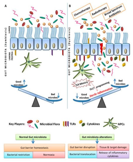 Chronic and recurrent inflammation in the gut triggers oxidative stress which depletes sensitive microbes, leaving resistant strains unaffected. This dysbiosis continuously and adversely agitates GALT to promote sterile inflammatory response and sensitizes the host for chronic gastric disease. Various evidence [,,,] suggests that changes in intestinal microbiota drive changes in the intercellular tight junctions like desmoglins, facilitate the leaky gut, and enhance the interaction of various danger signals (like) released from the dying bacterial cells with immune cells, thus promoting sterile inflammation. Increasing evidence suggests that dysbiosis is associated with inflammatory bowel disease and a wide range of malignancies. Peyer’s patches (PPs) are surrounded by follicle-associated epithelium (FAE), which forms the interface between the microenvironment of the lumen and the GALT. The FAE consists of specialized M cells that transport antigens and pathogens from the lumen towards underlying immune cells to regulate the immune response. The type of immune response depends upon the interactions between the immune cells located in the FAE and the lymphoid follicle. Immunological tolerance is developed against nonpathogenic normal microflora whereby generation of antigen-specific T cells suppresses activation of the immune system, thus protecting the mucosa from unnecessary inflammation. The gut microbiota and mucosal immunity constantly interact with each other to maintain intestinal homeostasis. However, if this balance is disturbed, dysfunction of the intestinal immune system occurs that further triggers a variety of diseases including IBD. Several studies indicated that intestinal dysbiosis causes an abnormal immune response leading to IBD inflammation and destruction of the gastrointestinal tract. Dysbiosis-driven chronic inflammatory and autoimmune diseases are associated with altered expression of pattern-recognition receptors (e.g., TLRs) and downstream signaling. Both innate immune and non-immune cells, such as intestinal epithelial and stromal cells, sense the pathogen-associated molecular patterns on microbial components mediated by their TLRs. Innate immune cells, such as dendritic cells and macrophages, sense pathogen-associated molecular pattern (PAMP) through TLRs, initiating rapid and effective inflammatory responses against microbial invasion.