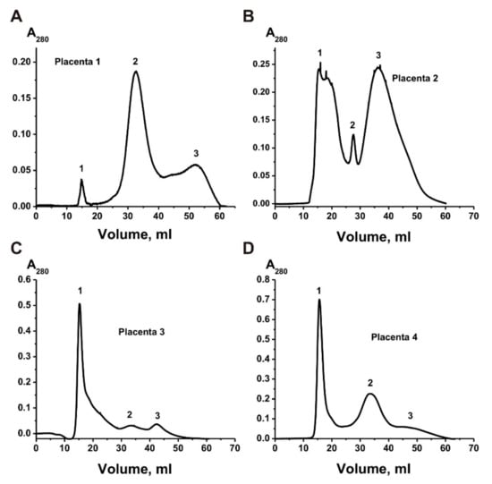 By centrifugation and ultracentrifugation according to [,,,,,,,,,,,,,,,,,] with some changes [], first, we obtained preparations enriched in exosomes from four human placentas. For additional purification of exosomes’ preparations, the obtained preparations were passed through filters (0.1–0.22 μm), and then gel filtered on a Sepharose 4B separating proteins of 60–20,000 kDa. Figure 1 shows four different gel filtration profiles—exosomes eluted at the first peak, which were separated from the two peaks of the impurity proteins. Four exosomes’ preparations demonstrate different ratios of the absorption (A280), corresponding to the first peaks of exosomes and two peaks of impurity proteins co-precipitated with them during different centrifugations.