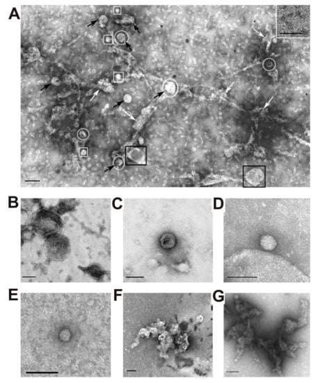Transmission electron microscopy, negative contrast. General view of the preparation of placental vesicles before gel filtration: vesicles with a diameter of less than 100 nm (black arrows), vesicles larger than 100 nm (black squares), microparticles (white squares), amorphous protein aggregates (white arrows), structures that look related to protein associates are highlighted with white ovals (A). Large membrane structures with a diameter of more than 100 nm (B); vesicles with a size of less than 100 nm (C), non-vesicles with a size of more than 40 nm (D); non-vesicle size less than 40 nm (E), clusters of aggregated proteins (F–G); ferritin ring structures (10–14 nm) (inset in Figure A). The length of the scale line is 100 nm.