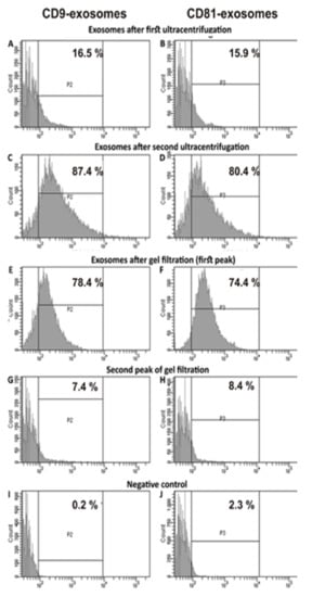 Flow cytometry of exosome preparations after two stages of ultracentrifugation and gel filtration. The relative amount of vesicles containing CD9 (left column of illustrations) and CD81 (right column of illustrations) are shown. All designations are given in panels (A–J).