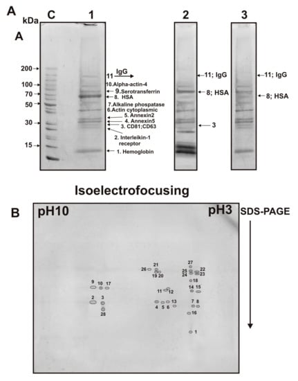 Next, we analyzed the proteins of the first peak obtained by gel filtration of the exo-3 preparation (Figure 1C) using 2D electrophoresis and identified 28 stained spots (Figure 6B) corresponding only to nine different proteins and their isoforms (Table 2). Interestingly, only one spot corresponded to the subunits of hemoglobin and annexin A1. The remaining spots corresponded to different isoforms of proteins (number of protein spots): annexin A2 (4), annexin A5 (3), cytoplasmic actin (7), alkaline phosphatase (5), HSA (2) and serotransferrin (2). Three protein spots were identified as light and heavy chains of immunoglobulins (Table 2). Thus, 2D electrophoresis allowed identification of only nine proteins. At the same time, three minor proteins CD81, CD63, and alpha-actin-4 were identified only after 1D electrophoresis; 2D electrophoresis allowed for identifying additionally annexin A1 (Table 2).