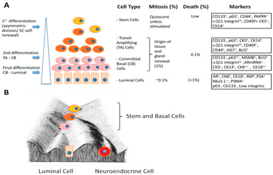 - Maitland, N.J. Stem Cells in the Normal and Malignant Prostate. In Prostate Cancer; Tindall, D.J., Ed.; Springer: New York, NY, USA, 2013; pp. 3–41. [Google Scholar]
