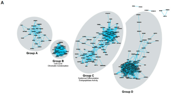 Our second assumption was that genes whose expression is changing during the differentiation process ought to be co-regulated in some way. Therefore, we re-analyzed our initial gene expression data on the basis of a high pair-wise correlation (Figure 2A) i.e., genes whose expression always moved up or down with at least one other gene in the group. We were able to identify four interaction networks of genes, which clustered closely together, Group A, B, C and D genes [26] (Figure 1A, Table 1). There were two additional striking features of this analysis. The first was that the four groups of interactomes were quite distinct, with no interconnections as often found in similar studies. Secondly, all four groups corresponded quite closely to particular elements within The Gene Ontology with the exception of Group A—the least tightly associated gene cluster [26]. Group B genes were associated with cell cycle and chromatin condensation, Group C, epidermal differentiation and endopeptidase activity, while Group D contained genes previously associated with cellular development. To extend the correlation, we analyzed a compendium set of 24,536 human Affymetrix gene expression microarrays from 800 experiments available online, containing expression data from at least 150 different human cell types, i.e., extending the gene co-expression to beyond just prostate epithelial differentiation. The final dataset contained about 1.2 billion expression correlations and clearly indicated that our initial grouping of co-regulated genes, based solely on prostate epithelial differentiation, was retained across many human tissues, implying that the control factors for such genes are highly conserved within different human pathologies and human differentiated cell types. Multiple transcription factors and a variety of steroid hormones were readily identified as potential primary regulators of the differentiation-associated gene sets in the prostate, for example, the tightly clustered Group C genes (associated with epidermal differentiation) [44,45]. Androgens, which control the terminal elements of prostate differentiation [46] had no discernable effect within the basal compartment whereas they were the primary driving force behind gene expression in purely luminal cells such as the LNCaP cancer cell line. The high biological activity of RA is perhaps not surprising, given its well-known effects on (i) cellular differentiation [44,47] (ii) cancer treatment (reviewed in [48]), and (iii) its potency in re-aggregation cultures of prostate cancers [49]. It was concluded that both retinoids and androgens are required to promote functional differentiation and that there should be a number of genes which are dually regulated by retinoic acid and androgens as the prostate differentiation pathway process proceeds [50]. Within the promoters of these genes e.g., the prostate transglutaminase (TGM4), the AR binding sites are in sufficiently close apposition to the pre-occupied retinoic acid binding site to imply that as androgen receptor levels in the nucleus increase, the bound retinoic acid response complexes are deposed by the AR complexes, resulting in a proposed switch for retinoic acid control to androgen receptor control [50].