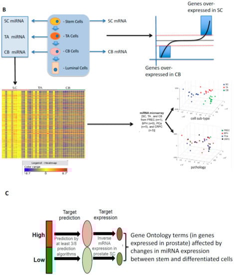 Strategies to categorize the genes and miRNAs which modulate prostate epithelial differentiation. (A) mRNA co-expression analysis in the transition from SC to CB (committed basal) cells in human prostate epithelial cells [26]. Clustering reveals gene pairs which always change together, in this transition and in other cell systems. Note the lack of overlap between the various gene clusters, implying a common control system for each cluster. Selected individual genes are listed in Table 1 and Table 2. Identification of individual genes is possible by zooming in electronically on the figure. (B) miRNA expression datasets were generated from different cell populations from prostate tissues with a variety of pathologies [27]. Unsupervised clustering of the miRNA database indicated that miRNA expression was more closely correlated to differentiation that normal/benign/cancer tissues. Note (lower right panel) the high expression of miRNA (warm color) in the SC, which decays in the TA population, with increasing downregulation (shown as blue) as the cells become more differentiated (CB cells) and begin to express a wider and more specialized mRNA set. (C) Gene ontology strategy to relate miRNA expression to that of mRNA known to be expressed in the various prostate epithelial cell types [28].
