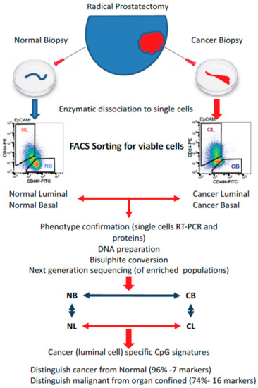 As a test of this hypothesis, we have recently carried out a genome-wide DNA sequencing of bisulfite-modified DNA extracted from multiple cell types, enriched according to their phenotype [128]. In contrast to all previous studies, the cells used had been directly enriched from disaggregated tissue biopsies of radical prostatectomies. In addition to a scan-directed intra-tumoral biopsy, we also obtained a normal tissue biopsy from a cancer-free location in the patient’s gland. The presence/absence of cancer in the tumor/normal needle cores was confirmed by subsequent histology. The procedure is outlined in Figure 4. After the methylated CpG sequences had been assigned to various loci, the closest association between patterns of methylation assigned different samples to the original patient, followed by the differentiated cell type of origin. Therefore, many of the existing genome-wide CpG methylation signatures for prostate cancer [120,129] will be contaminated with patient-specific signals and affected by the cellular composition of the biopsies used. To overcome this bias, the patient and cell-type specific signals were removed, allowing a direct comparison of non-malignant vs malignant epithelial populations in each patient. Here, very few CpG methylation changes were seen in the basal compartment: all of which were related to the gene ontology terms cell motility and cell adhesion—both essential properties of a cancer stem-like cell relative to its normal equivalent. However, for a comparison of normal and malignant tissues to be valid, and perhaps applicable in the clinic, normal luminal cells relative to the 99% of luminal-like cells in cancer biopsies are the most useful comparison. When this was carried out, again relatively few gene ontology terms were involved, but most notably CpG methylation was related to the luminal cell proliferation in cancer, relative to the terminally differentiated non-dividing status of normal luminal cells.