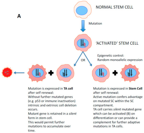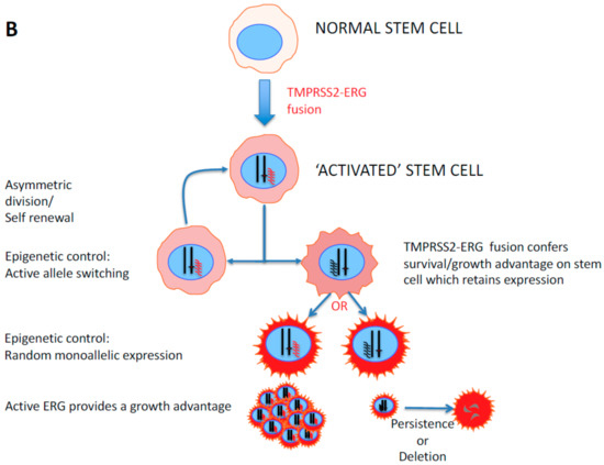 The latter events are illustrated schematically in Figure 5A. Here the activating mutation (or epigenetic control) in the stem cell either is neutral (left) or confers a selective advantage for the SC (right). As shown on the left panel, in the absence of other changes, the self-renewal results in a SC which does not express the activated oncogene copy, but rather the wild-type allele, whereas the TA cell does express the activating allele and may either expand or as illustrated for a single change, suffer intrinsic or extrinsic deletion. However, the SC remains as a pool in the heterozygous state, which can be subject to further change in a pre-tumor progression [34]. The right panel shows the state when the activating gene does confer a selective advantage (like ERG in TMPRSS2-ERG fusions) [162,163]. In this case, the TA cell retains the mutation, can expand and may restore expression of the mutant gene if RME is truly random, as we suspect (Figure 5B). Hence clones of cells within the tumor, as seen in many immunohistochemical studies of prostate cancer, could ultimately emerge. This might also explain the increasing prevalence of “cancer mutations” in apparently normal tissues adjacent to tumor cells [164].