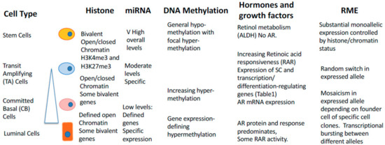 There is a prominent role for each of the major epigenetic control mechanisms in prostate epithelial cell differentiation. Histone modifications and changes to chromatin configuration provide the initial overall control of transcription and the selection of allelic preferences in gene expression. A cell stage-specific representation of this is shown in Figure 6. However, as stated earlier, there is a continuum of phenotypic changes between the defining asymmetric division of SC and the final and terminal differentiation into luminal cells.