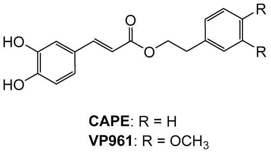 Figure 1. Chemical structure of caffeic acid phenethyl ester (CAPE) and VP961-CAPE derivative.